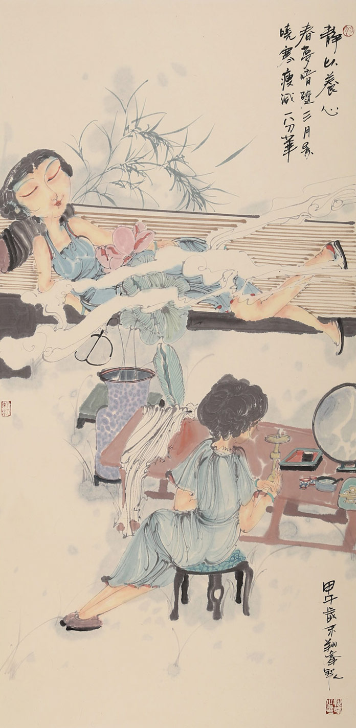 面對(duì)當(dāng)下東西方文化和意識(shí)交融的現(xiàn)代社會(huì),李翔峰在繼承傳統(tǒng)東方審美情趣的基礎(chǔ)上,探索當(dāng)代意 識(shí)的圖示形式,形成具有個(gè)性特點(diǎn)的繪畫(huà)格調(diào)和語(yǔ)言風(fēng)格。特別是在線描和夸張化造型方面他有自己的認(rèn)識(shí),他對(duì)用線比較敏感,有種酣暢淋漓的自由趣味,這種藝 術(shù)語(yǔ)言在創(chuàng)作顯得輕松自如。在線的表現(xiàn)上,他更進(jìn)一步地做到了以“意”勾線,隨性而通,利用線的穿插、輕重、疏密來(lái)體現(xiàn)畫(huà)面的虛實(shí)關(guān)系,實(shí)處之妙,因虛而 生,通過(guò)虛實(shí)強(qiáng)弱的布置顯示物象的空間感。他的工筆畫(huà)面主體是當(dāng)代女性,人物服飾和裝飾道具都具有時(shí)代特性,背景做的是田園化的處理,用寫(xiě)實(shí)含蓄的手法表 達(dá)一種在當(dāng)代社會(huì)中人們對(duì)自然的向往,強(qiáng)調(diào)人與自然的和諧,希望人們?cè)诙际兄姓业叫闹械囊黄耢o之地。