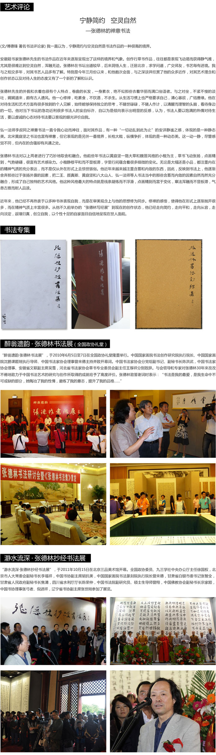 2010年6月在全國(guó)政協(xié)禮堂舉辦《醉翁遺韻》張德林書法展,2011年10月在北京三品美術(shù)館舉辦“瀞水流深”張德林抄經(jīng)書法展。出版有《張德林書法集》,《張德林抄經(jīng)書法集》,《張德林對(duì)聯(lián)集》,《張德林楷書金剛經(jīng)》等。