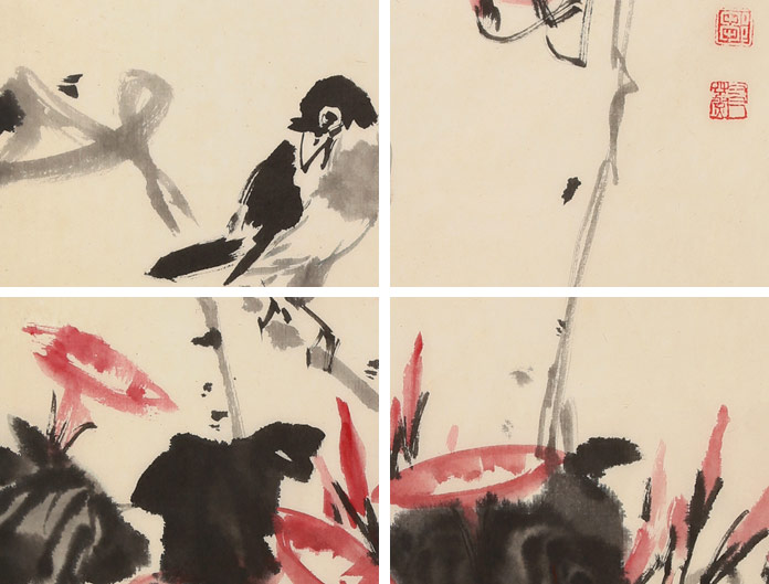 友蒸先生筆下之山水,深弘靜穆,古意盎然,頗具宋明之風(fēng); 花卉翎毛果蔬魚藻,靈秀飄逸,神氣閑雅,力追八大、吳昌碩等。而以筆簡(jiǎn)神肖之麻雀引領(lǐng)諸寫意小品,生氣勃勃,莊諧可人,世譽(yù)“鄒麻雀”。其麻雀畫技法,被列入世界非物質(zhì)文化遺產(chǎn),《雀陣圖》入編世界吉尼斯紀(jì)錄。