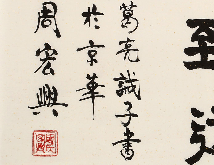 周宏興教授自幼酷愛書法藝術(shù),多年潛心研究與學(xué)習(xí)漢隸名碑,汲取眾家之長(zhǎng),周宏興逐漸形成了自己的凝重,古樸高標(biāo)逸韻的風(fēng)格,可謂典型的“文人書法”。近年來(lái)經(jīng)過(guò)苦心鉆研,先生又以指代筆,創(chuàng)造了“隸體指書”新書體。被專家譽(yù)為“中國(guó)隸體指書第一人,開創(chuàng)書法審美新天地”。 2004年9月29日晚,周先生應(yīng)國(guó)家副主席曾慶紅之邀參加了在首都人民大會(huì)堂舉行的中秋國(guó)慶招待會(huì),同時(shí)他在人民大會(huì)堂澳門廳向佳賓們展示其隸體指書長(zhǎng)卷蘇東坡《水調(diào)歌頭》,引起與會(huì)者極大震驚。 周宏興教授的書法藝術(shù)受到海內(nèi)外廣泛的關(guān)注。他曾四次赴日本舉行書法展和講學(xué)。其作品被我國(guó)和日本,韓國(guó),美國(guó),英國(guó),印度,加拿大,馬來(lái)西亞等眾多的國(guó)際友人珍藏,數(shù)百家藝術(shù)館,博物館和報(bào)刊雜志收藏和刊登,并刻石于北京,山東,云南,廣東,安徽,浙江等地,中南海和全國(guó)政協(xié)禮堂均收藏了他的巨幅書法作品,我國(guó)黨和國(guó)家一些領(lǐng)導(dǎo)人,美國(guó)前總統(tǒng)布什,國(guó)務(wù)卿奧爾布賴特,希拉里等均收藏了他的隸書或隸體指書作品。