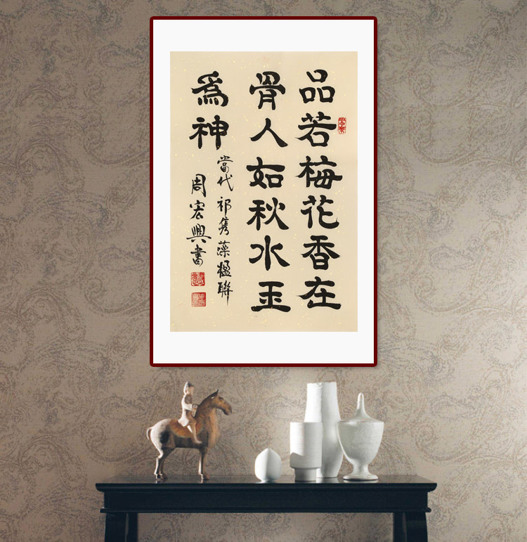 周宏興教授自幼酷愛書法藝術(shù),多年潛心研究與學習漢隸名碑,汲取眾家之長,周宏興逐漸形成了自己的凝重,古樸高標逸韻的風格,可謂典型的“文人書法”。近年來經(jīng)過苦心鉆研,先生又以指代筆,創(chuàng)造了“隸體指書”新書體。被專家譽為“中國隸體指書第一人,開創(chuàng)書法審美新天地”。 2004年9月29日晚,周先生應國家副主席曾慶紅之邀參加了在首都人民大會堂舉行的中秋國慶招待會,同時他在人民大會堂澳門廳向佳賓們展示其隸體指書長卷蘇東坡《水調(diào)歌頭》,引起與會者極大震驚。 周宏興教授的書法藝術(shù)受到海內(nèi)外廣泛的關(guān)注。他曾四次赴日本舉行書法展和講學。其作品被我國和日本,韓國,美國,英國,印度,加拿大,馬來西亞等眾多的國際友人珍藏,數(shù)百家藝術(shù)館,博物館和報刊雜志收藏和刊登,并刻石于北京,山東,云南,廣東,安徽,浙江等地,中南海和全國政協(xié)禮堂均收藏了他的巨幅書法作品,我國黨和國家一些領(lǐng)導人,美國前總統(tǒng)布什,國務卿奧爾布賴特,希拉里等均收藏了他的隸書或隸體指書作品。