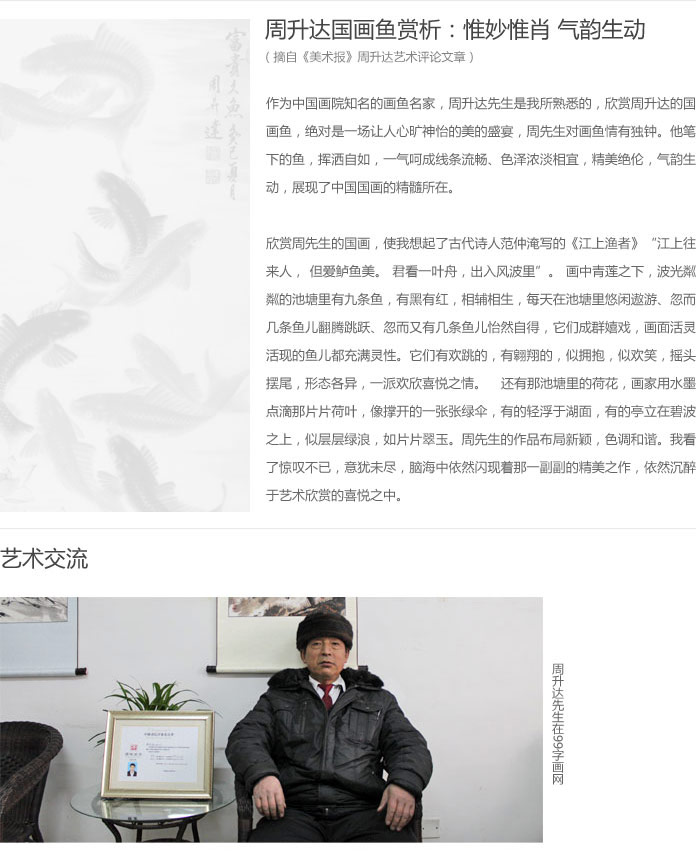 周先生是中國當代畫壇畫魚的名家,他的魚畫具有極高的欣賞和收藏價值。 周先生,1953年出生于北京,自幼喜習繪畫。1977年考入中國畫院,專事繪畫工作。1981年作品“魚躍圖”參加北京市工筆重彩國畫展獲二等獎;“魚水 情深”參加北京群眾美展獲一等獎;“富貴久魚”參加世界美術(shù)巡回展并獲二等獎偶并被國家收藏。1985年后,在北京,天津,安徽,上海等美術(shù)出版社發(fā)表作 品百余幅,并多次赴美國,日本,新加坡參加中國年畫展,獲得國際朋友的好評。周先生為人謙和誠樸,不事炒作,孜孜于畫藝,其書畫體現(xiàn)了深 厚的功力,有濃厚的文人氣息,"朋友俱是清流客,只緣最愛是青蓮"此溪石翁詩句也是周先生人格的體現(xiàn).其作品均為行家所推崇!