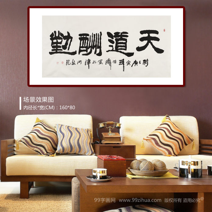 【作品簡評】 “天道酬勤”這個成語的意思是:上天會偏愛勤奮的人們,多付出的努力一定會有更多的回報,也說明了機遇和靈感往往只垂青于孜孜以求的勤勉者?!疤臁敝浮吧咸臁保暗馈敝浮爸鲝垺?,“天道”即“天意”,可以引申為客觀的規(guī)律;“酬”可解釋為“實現(xiàn)志愿”,即酬答、回報,“勤”為“勤奮”。就是說“天意厚報那些勤奮的人”。所以總的意思是說:勤奮的人會得到更多的回報。 天道酬勤適宜懸掛在家中書房、辦公室中,是常見的勵志書法。