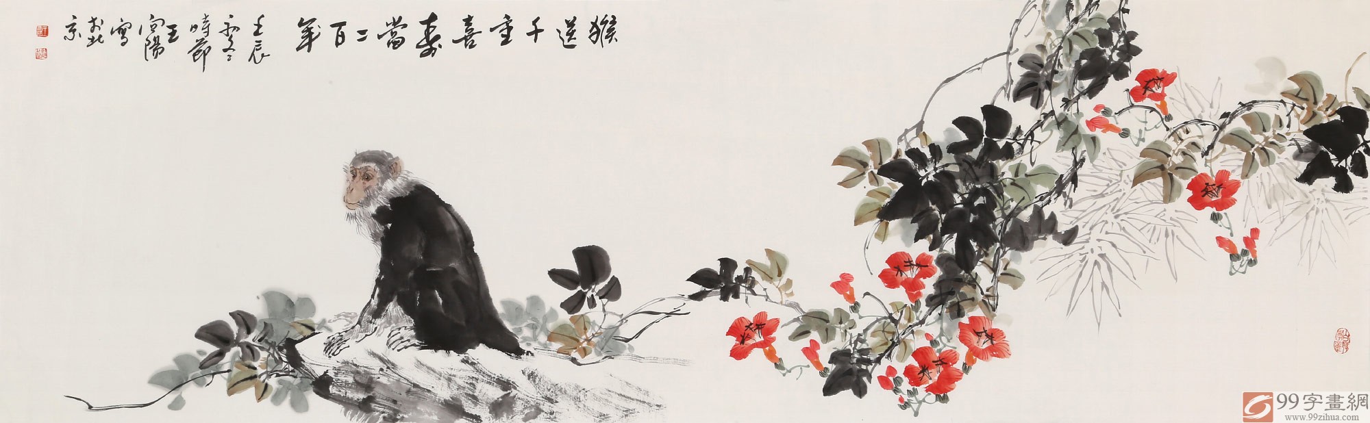 【作品簡(jiǎn)評(píng)】(99字畫網(wǎng)藝術(shù)評(píng)論員曉曼)中國(guó)人認(rèn)為猴是吉祥物,由于漢字“猴”與“侯”諧音,在許多圖畫中猴的形象表示“封侯”的意思。如一只猴子爬在楓樹上 掛印,叫“封侯掛印”,一只猴子騎在馬背上,叫“馬上封侯”;兩只猴子坐在一棵樹上或者一只猴子騎在另一只猴子背上叫“輩輩封侯”;寓意:封為侯爵、代代 封侯。