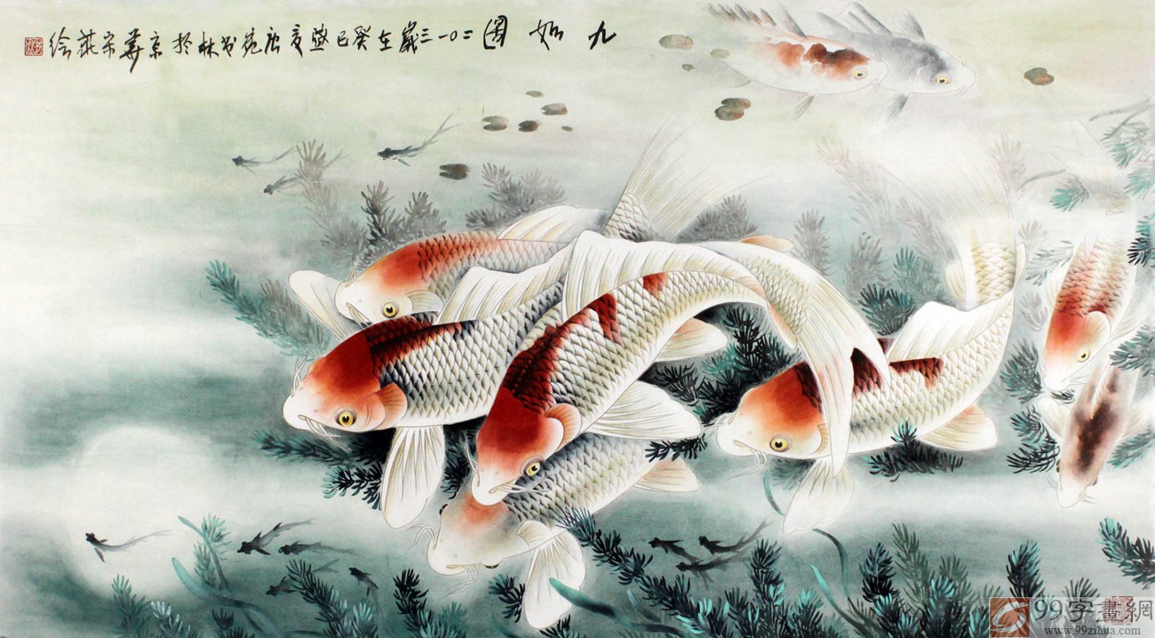 【作品簡(jiǎn)評(píng)】(99字畫(huà)網(wǎng)藝術(shù)評(píng)論員玉潔)魚(yú)是水中的精靈,流水川流不息,寓意財(cái)源滾滾、寶財(cái)以水而來(lái);在九魚(yú)圖風(fēng)水中,魚(yú)與余諧音,表示吉祥的祝福,包含有深深的祝福之意;九與久諧音,表示長(zhǎng)久的富足。此幅風(fēng)水畫(huà)作《九如圖》出自董書(shū)林之手,此畫(huà)面設(shè)色淡雅、明快清新,魚(yú)鱗整齊地排列著,幾株水草在游魚(yú)的嬉戲下?lián)u擺不定,襯托得更加真實(shí)自然,九條活潑可愛(ài)的魚(yú)兒各具神態(tài),或低頭、或俯仰、或翹尾、或回眸......它們互相的嬉戲玩耍,曼妙的身姿靈動(dòng)而富有極強(qiáng)的藝術(shù)審美效果,是如今客廳、酒店風(fēng)水裝飾畫(huà)之選!