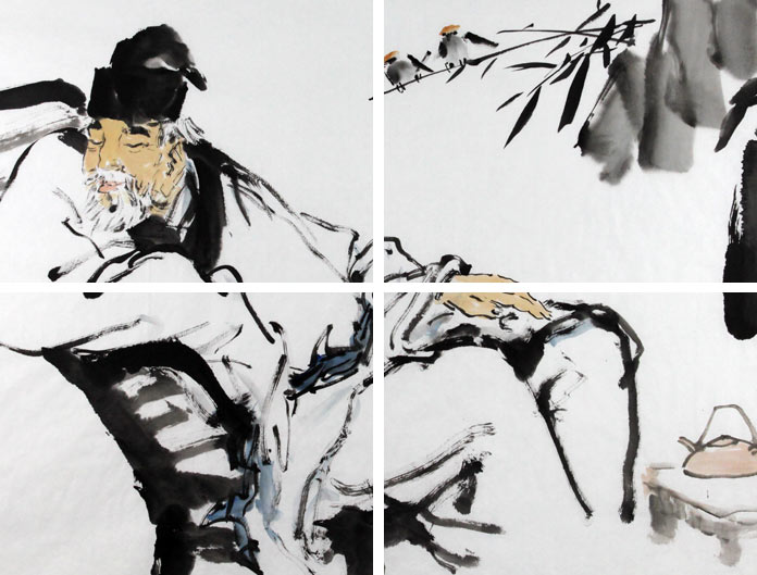 東坡先生小坐藤床之上,午倦小睡。一位飽經(jīng)世事滄桑,看慣世態(tài)炎涼的老人,此刻,享受著春日的微風(fēng),周圍一片寂靜,只有偶爾飛上枝頭的鳥兒在竊竊私語。畫家通過嫻熟的筆墨,將這樣一個(gè)動(dòng)人的場(chǎng)景呈現(xiàn)在觀者面前,凝視此畫久久,令人心境閑適,玩味不盡?,F(xiàn)代的都市,人人忙碌不堪,當(dāng)我們偶然停下來,把目光投向我們熟悉卻又時(shí)常忽略的生活角落,每一個(gè)瞬間,都無比美好,“靜觀萬物皆自得”,正是此意。