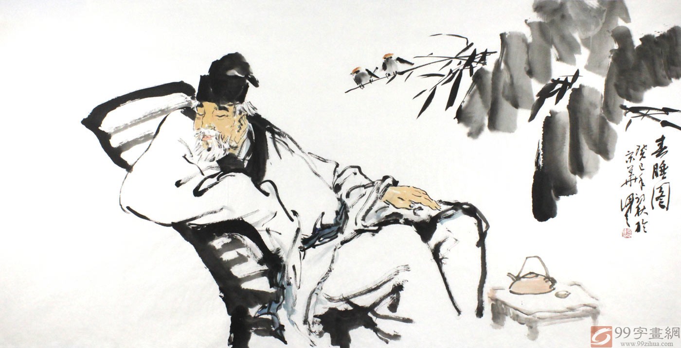 【作品簡(jiǎn)評(píng)】(99字畫網(wǎng)藝術(shù)評(píng)論員曉曼)此幅畫家靈感來源于東坡先生一首絕句:白頭蕭散滿霜風(fēng),小閣藤床寄病容。報(bào)道先生春睡美,道人輕打五更鐘。
