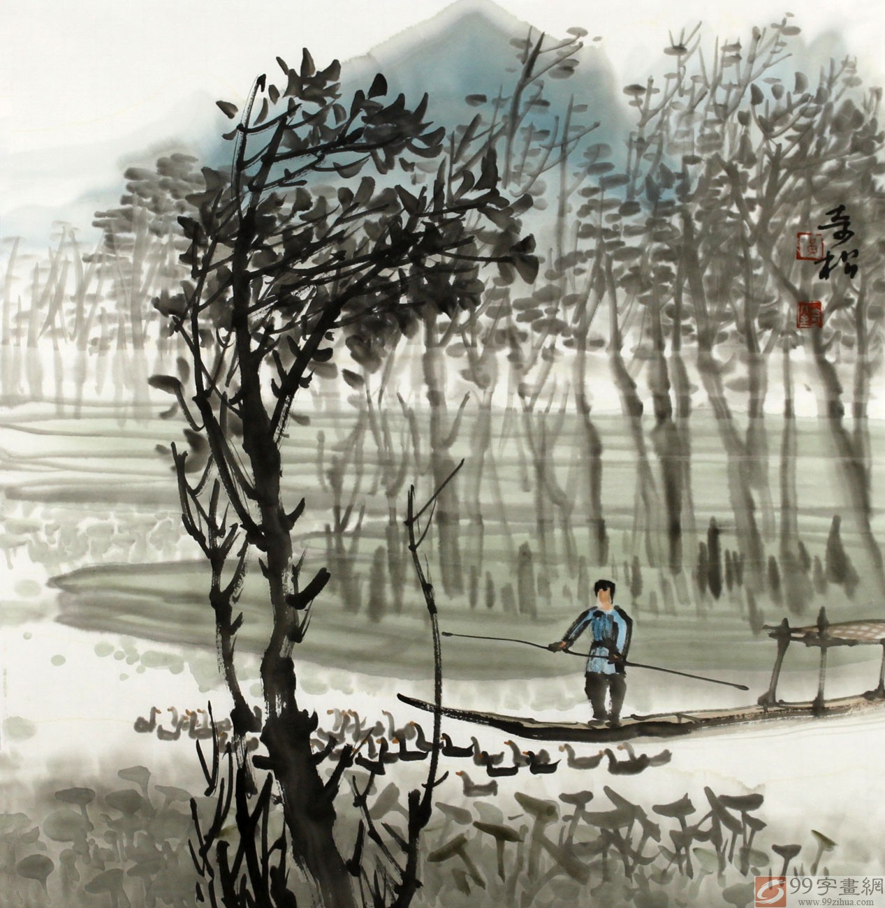 【作品簡(jiǎn)評(píng)】 (99字畫(huà)網(wǎng)藝術(shù)評(píng)論員曉曼) 黃奇松先生的國(guó)畫(huà)山水《放鴨圖》,繪涼爽的河邊,樹(shù)木青翠,微風(fēng)吹拂,一居民劃著船槳在河中放鴨子的場(chǎng)面。一群鴨子呈“一”字形排列,在河中自由自在地游著,碧綠的青草在岸上茁壯地生長(zhǎng),一幅寧?kù)o而又溫馨的江邊美景映入觀者眼簾,是玄關(guān)字畫(huà)、客廳字畫(huà)之選,推薦選購(gòu)!