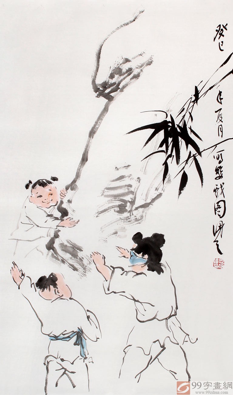 【作品簡評】(99字畫網藝術評論員曉曼)《嬰戲圖》即描繪兒童游戲時的畫作,又稱“戲嬰圖”,是中國人物畫的一種。以小孩為主要繪畫對象,以表現(xiàn)童真為主要目的,畫面豐富,形態(tài)有趣。畫面上的兒童或玩耍,或嬉戲,千姿百態(tài),妙趣橫生。