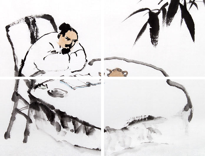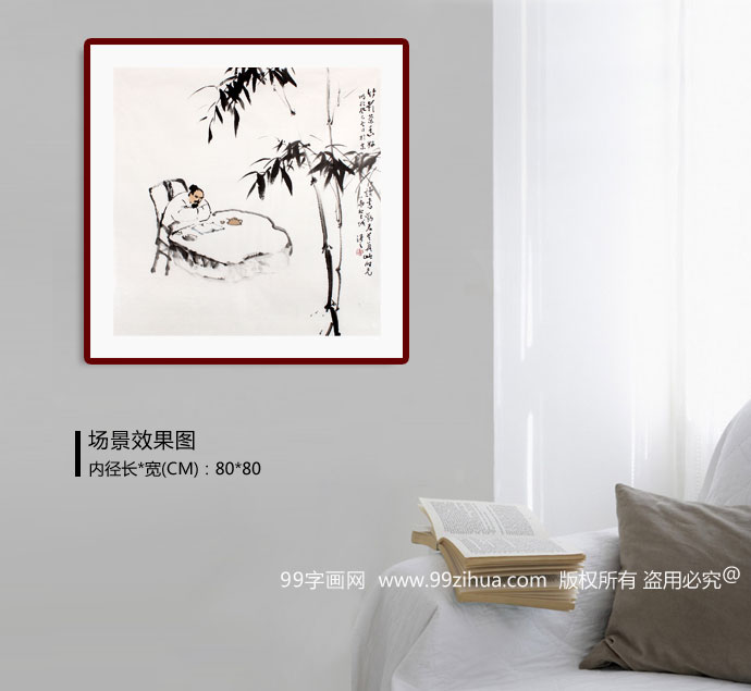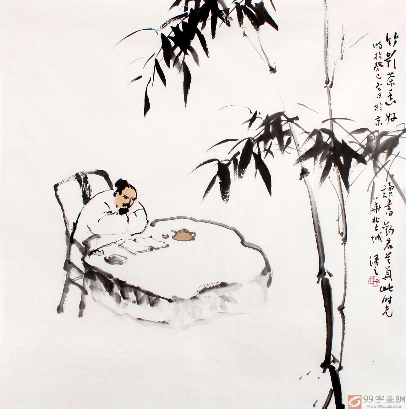 【作品簡(jiǎn)評(píng)】(99字畫(huà)網(wǎng)藝術(shù)評(píng)論員曉曼)陳漫之先生的這幅作品《竹影茶香好讀書(shū)》,描繪兩株秀挺的青竹之下,一老者坐于凳子上,兩手揣袖,專(zhuān)心致志地讀書(shū),桌上放有茶盞、筆墨等,一副專(zhuān)注讀書(shū)的神態(tài)躍然紙上。此畫(huà)墨竹用筆瀟灑,巧妙分割畫(huà)面,人物用筆雖簡(jiǎn)而神態(tài)畢現(xiàn)。