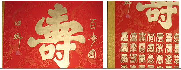 四尺純手工書寫“百壽圖”,黃色錦凌精裱,由一百種不同的壽字組成,壽字是我們對長輩用的最多的一個字之一,“百壽圖” 祝福長輩長壽,適用于送給長輩,送給老人,祝壽字畫禮品。
