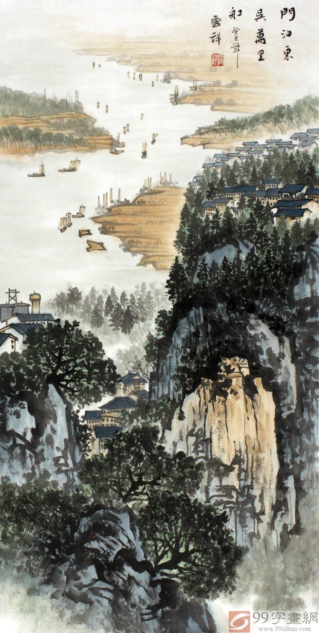杜云祥先生的這幅國畫山水《門泊東吳萬里船》,構(gòu)圖講究,意境深邃,座座房屋立于山間,在這秀雅而又寂靜的山間可以靜享此美景,從窗口透過可以看見門外停泊著從遙遠的東吳來的船只,它 們緩緩地向前滑行,流向另一方彼岸??v觀此幅畫作,如親自游玩一樣暢游而又無阻,是一幅大氣山水畫作,推薦選購裝飾!