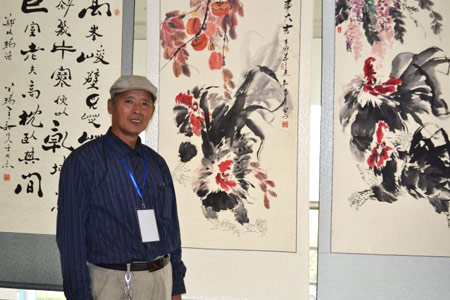 和平大師也畫國畫。在國慶與仲秋同賀的熱點基地,我見識到和平大師用墨汁和利用用其他畫家畫牡丹剩下的油彩,畫出奔騰如飛的駿馬圖與有趣的小雞吉祥圖?!断瞾淼健樊嬌系拇蠊u與小雞雛望向上方一角,像篩底的蜘蛛網(wǎng)垂下一根銀色絲線,下面吊著一只黑蜘蛛。另一幅《雞趣》有一群形態(tài)各異的雞,有一只雞回頭嘴啄向地,仔細一看是要啄小小的綠色螳螂,綠色螳螂抬起細線樣的脖子,翹起硬夾子前腿抵抗。當和平大師畫一對比冀雙飛的馬時,立在一旁觀看的熱點網(wǎng)友等待夫妻倆,便稱倆人都屬馬。后來又說一家三匹馬,兒子也屬馬。可是那幅雙馬圖已畫完。大家便鼓動和平大師補上一匹小馬。馬補上了,大家贊不絕口,都說天衣無縫。我也感覺這幅馬的畫面更完整完美,意境深遠了。和平大師說自己的書法不好,請書畫家朋友耿振洲給自己的畫簽字,讓人不能不敬佩他的謙虛和品德!